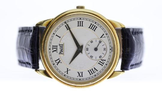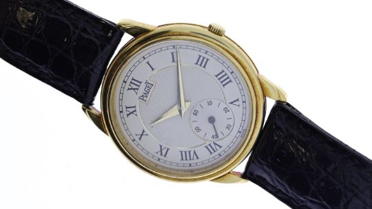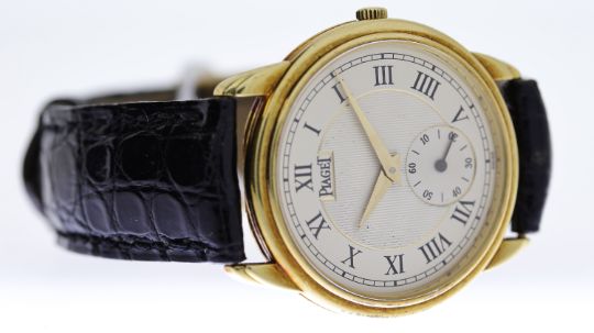 18CT PIAGET GOUVERNEUR REFERENCE 15968 WITH BOX, circular silver dial with roman numeral hour markers, subsidiary seconds, 33mm 18ct yellow gold case, Piaget black leather strap with a 18ct Piaget buckle, screw down case back engraved reference "15968", manual wind movement, comes with a Piaget box, currently running.