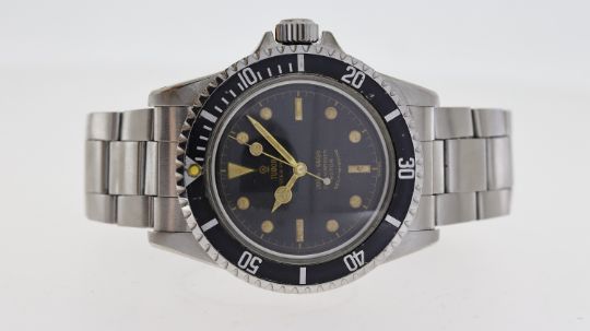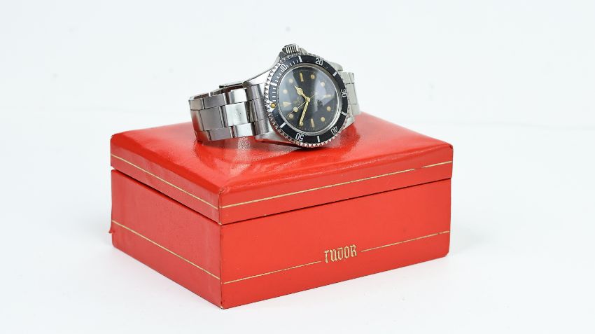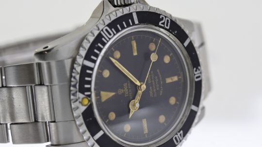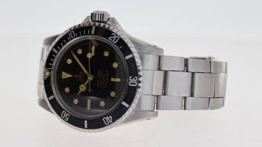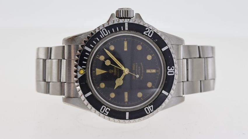 VINTAGE TUDOR OYSTER PRINCE SUBMARINER 7928 CIRCA 1962, circular black gilt dial with baton hour markers, gilt hands, bi-directional bezel with a long 5 bezel insert, approx 40mm stainless steel case, pointed crown guards, Rolex screw down crown, Tudor stainless steel bracelet, screw down case back, inner case back engraved reference "7928" / "III.62", Tudor signed automatic movement, 17 jewels, comes with a Tudor red box, circa 1962, 379*** serial number, currently running.