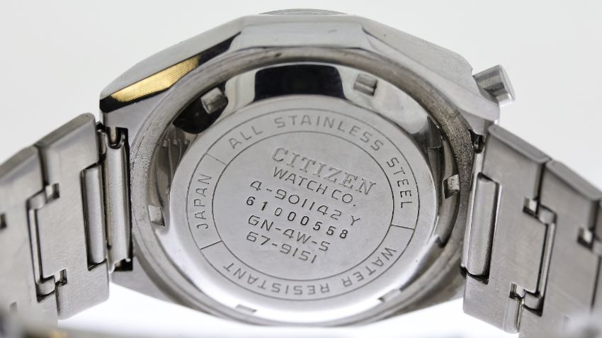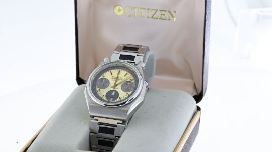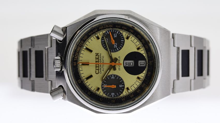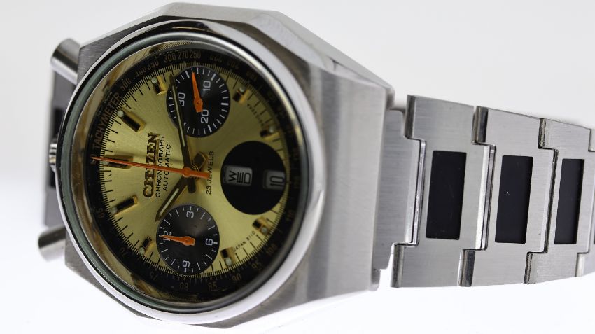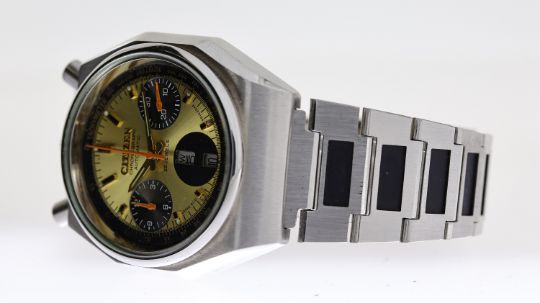 CITIZEN BULLHEAD CHRONOGRAPH AUTOMATIC WITH BOX, circular gold dial with baton hour markers, chronograph function with three subsidiary dials, orange hands, day and date apertures at 6 o'clock, approx 38mm stainless steel case, Ctizen stainless steel bracelet, automatic movement, comes with a Citizen box, currently running.