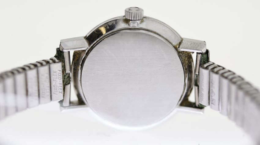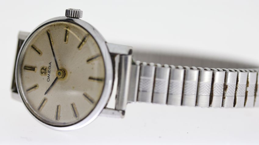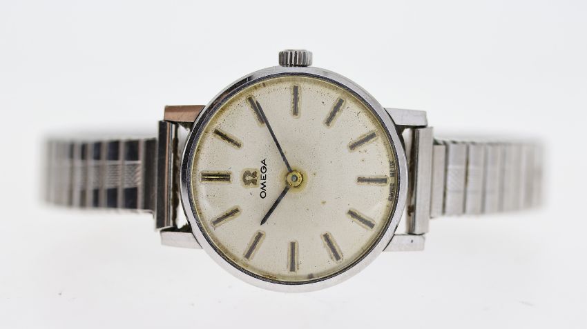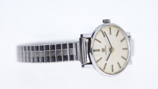 VINTAGE LADIES OMEGA WRISTWATCH, approx 23mm stainless steel case, expandable bracelet, not running.