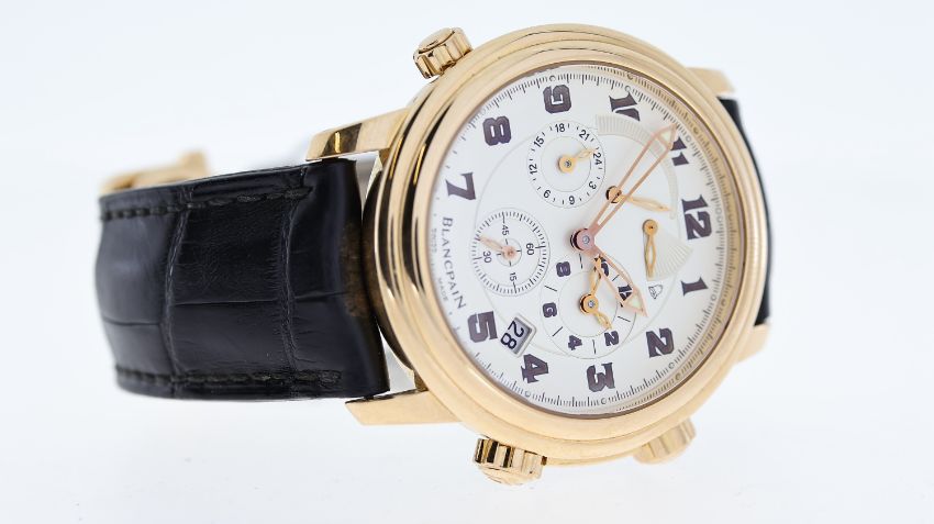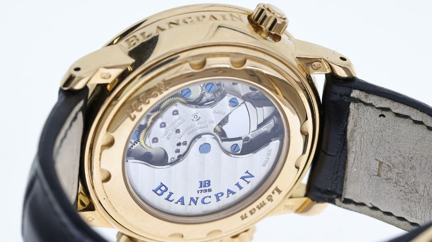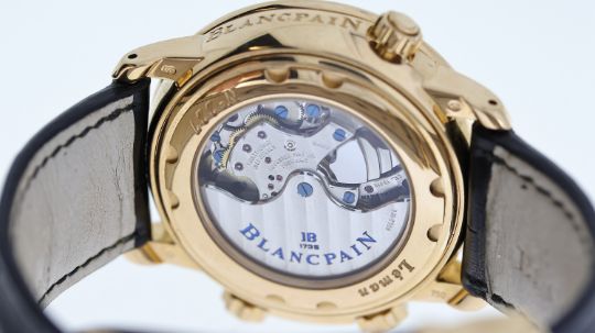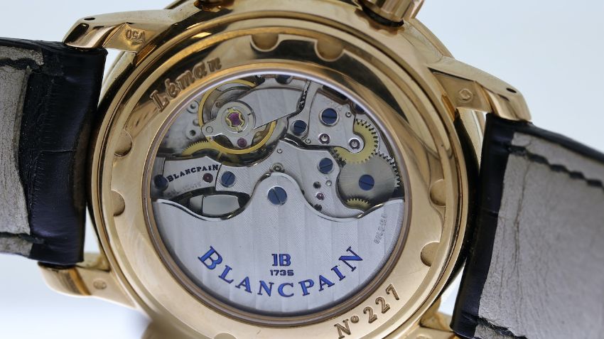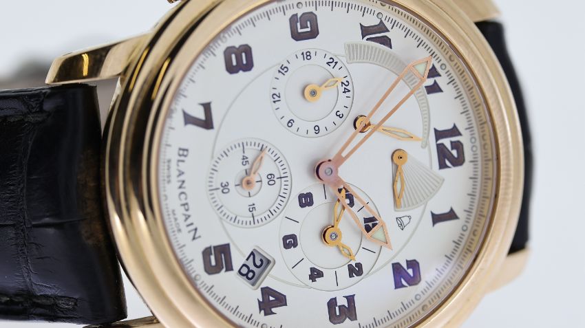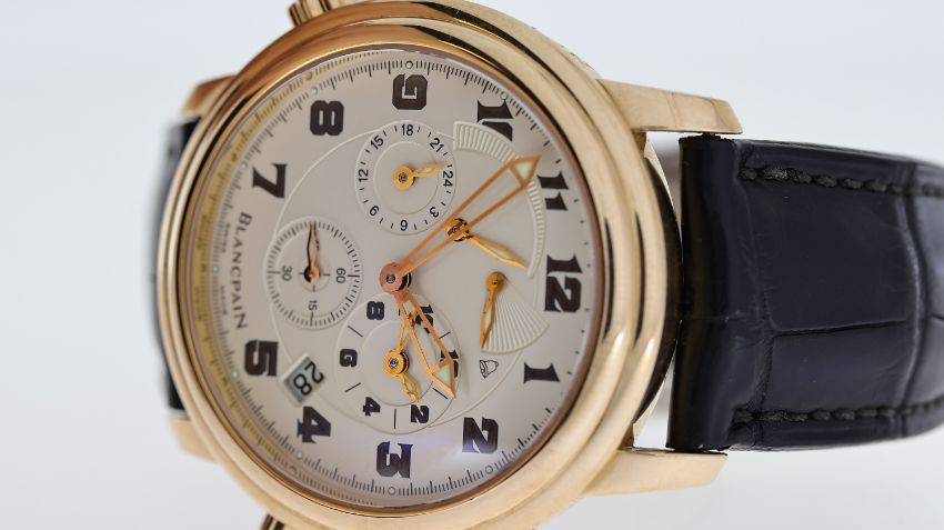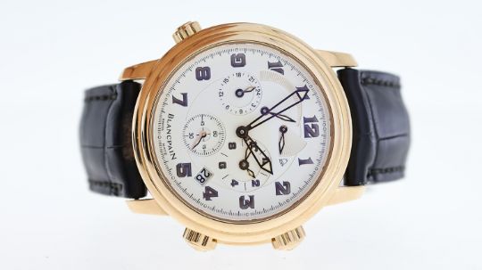 18CT BLANCPAIN LEMAN DUAL TIME REFERENCE 2041-3642M-53B, named after Lake Geneva, circular silver dial with arabic numeral hour markers, subsidiary seconds, dual time, date aperture at 4:30, power reserve indicator, alarm function with a power reserve indicator, 40mm 18ct rose gold case, Blancpain black leather strap with an 18ct Blancpain deployant clasp, screw down display case back, No 227, Blancpain calibre 1241C automatic movement, 38 jewels, comes with a Watchfinder box and receipt, reference 2041-3642M-53B, currently running.