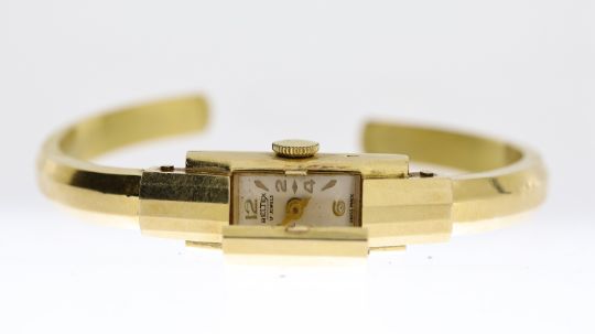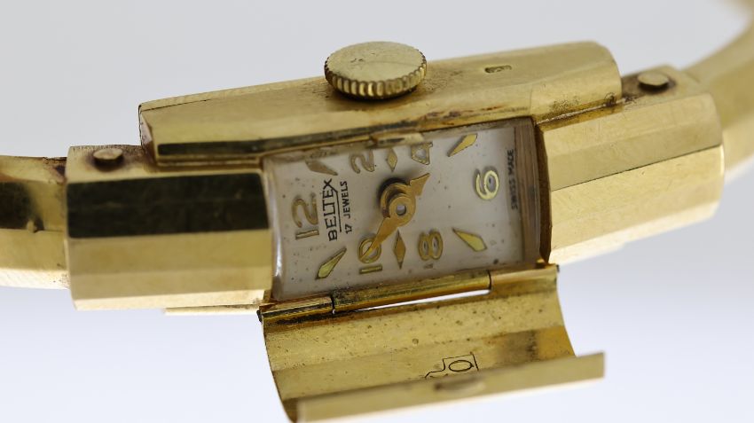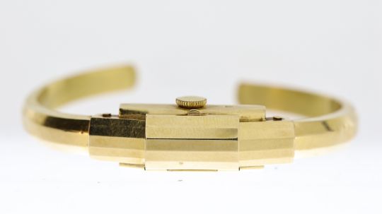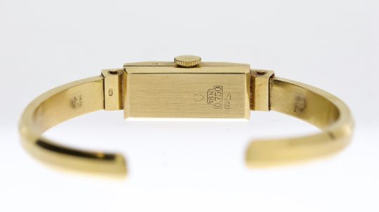 18CT BELTEX BANGLE WRISTWATCH, rectangular white dial with baton and arabic numeral hour markers, fully enclosed hinge case design, case and bangle hallmarked 18ct, manual wind movement, 10mm by 32mm case, manual wind movement, currently running.