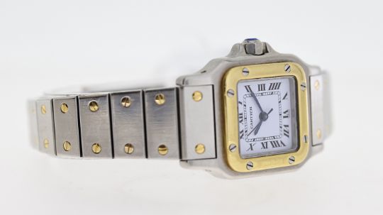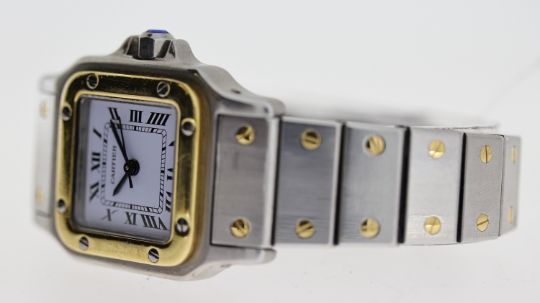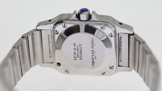 LADIES CARTIER SANTOS AUTOMATIC, square white dial with roman numeral hour markers, blued hands, approx 24mm stainless steel case, gold bezel, integrated Cartier stainless steel bracelet, automatic movement, currently running.