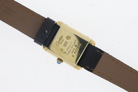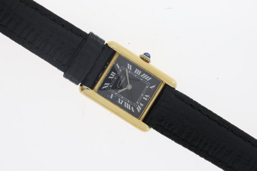 Brand: Cartier Model Name: Must De Cartier Tank Reference: 170398 Movement: Manual Wind Dial colour: Black Dial features: White Arabic numerals and track Case size: 21mm Case material: Silver gilt Case features: Cabochon set crown Bracelet or strap: Later black leather strap and buckle Condition report: Currently running