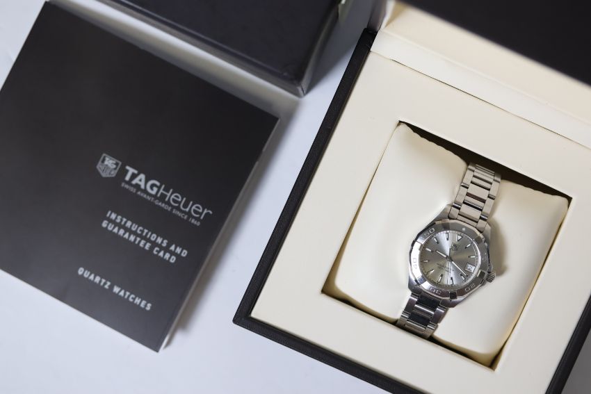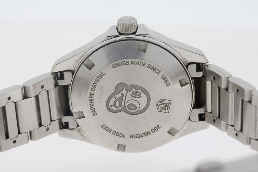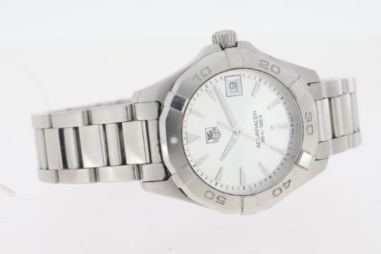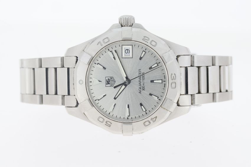 Brand: Ladies Tag Heuer Model Name: Aquaracer Reference: WAY1311 Complication: Date Movement: Quartz Box: Yes Dial shape: Circular Dial colour: Sunburst, Silver Dial features: Silver/Lume hands and baton hour markers. Date aperture at 3 o'clock. Bezel: Uni-rotational bezel. Case size: Approx 32.5mm Case material: Stainless Steel Case features: Signed Crown Case back: Screw Down Bracelet or strap: Tag Heuer Bracelet Bracelet material: Stainless Steel Bracelet features: Fold Over Clasp Condition report: Currently running