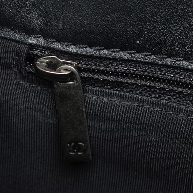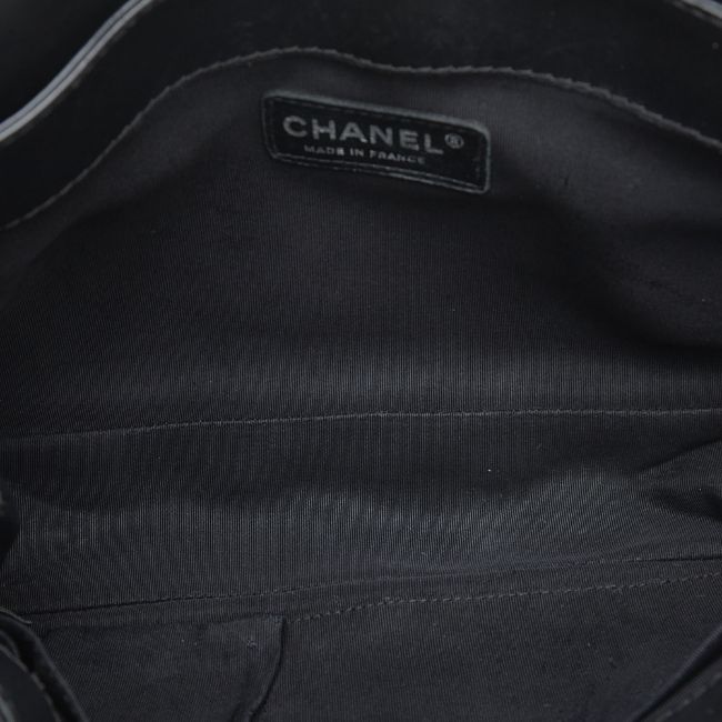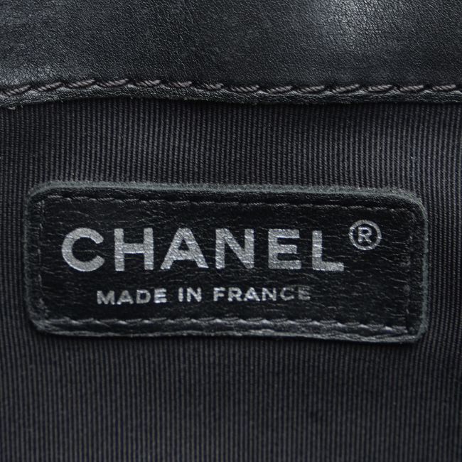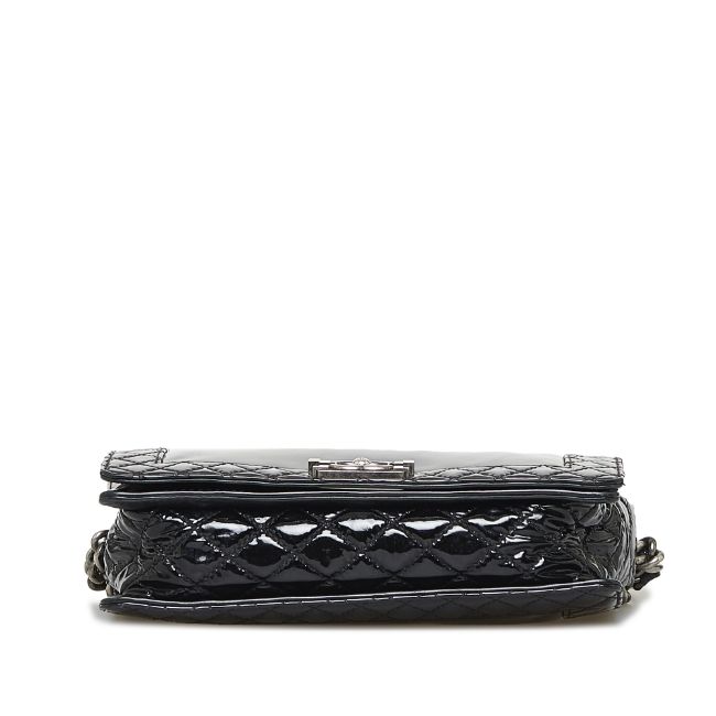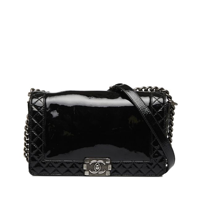 The Boy Bag features a patent leather body, a chain-link shoulder strap, a front flap with push-lock closure, and interior slip pockets. It carries a B:B condition rating.