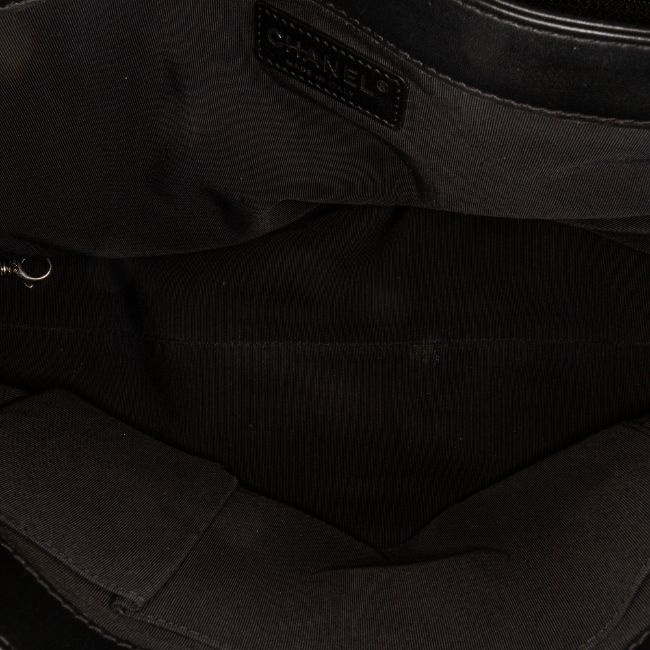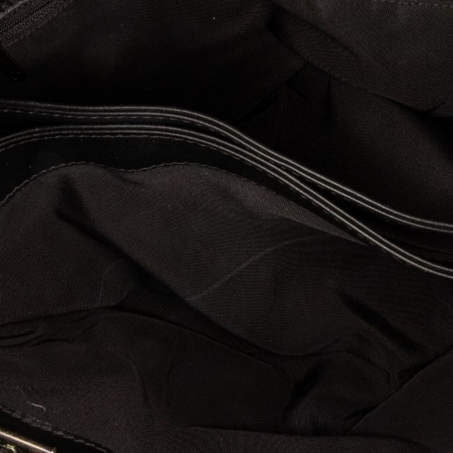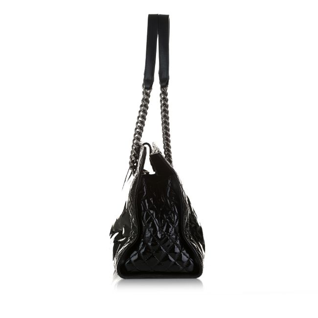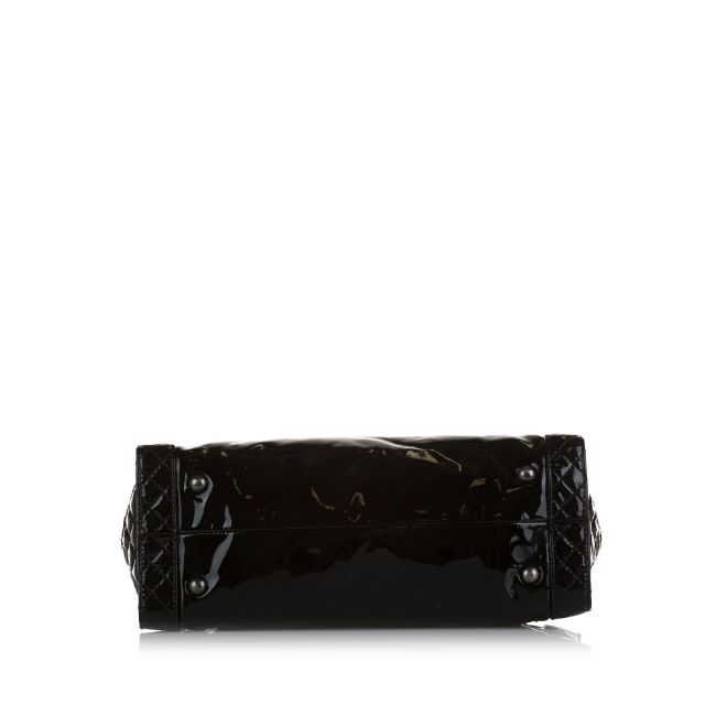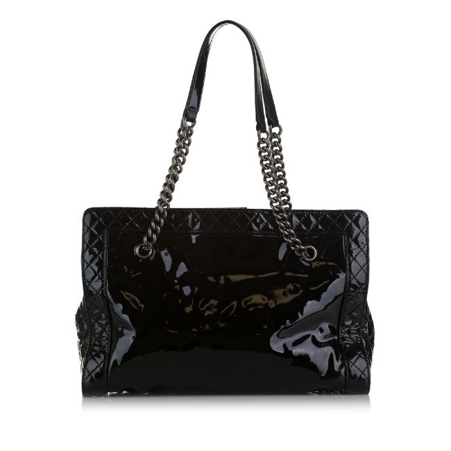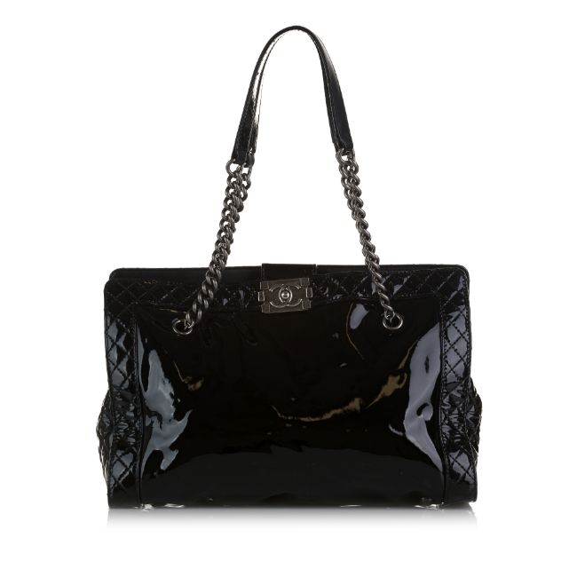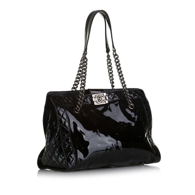 This tote bag features a patent leather body, curb chain shoulder straps, an open top with push lock closure, and interior zip and slip pockets. It carries a B:B condition rating.